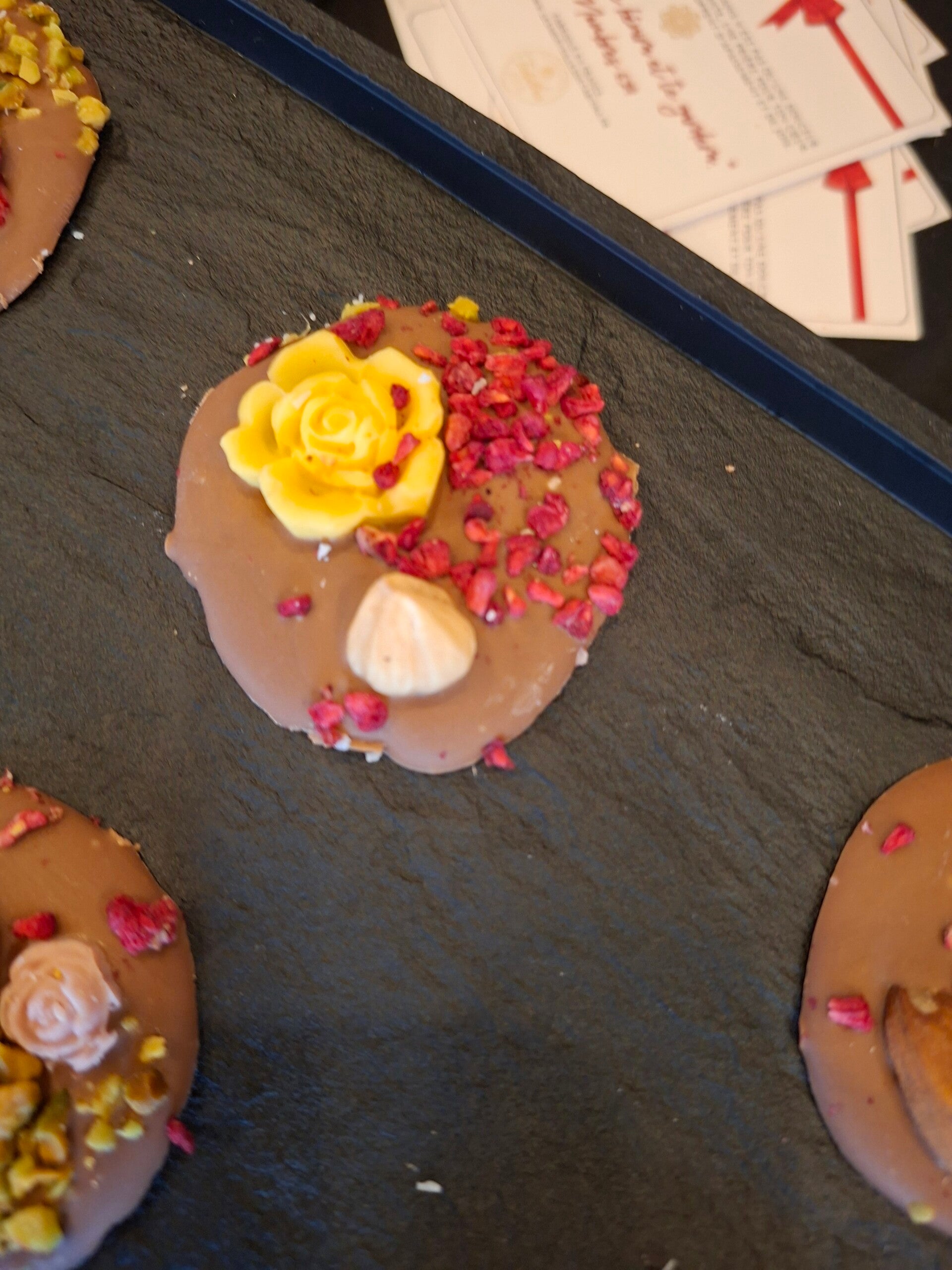 6 disques de chocolat de haute qualité aromatisés ( caramel, blanc vanille tahiti, framboise, mangue...)